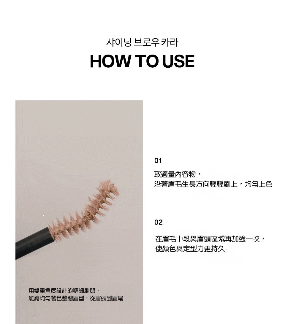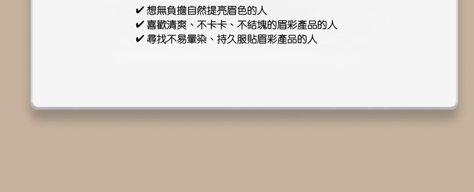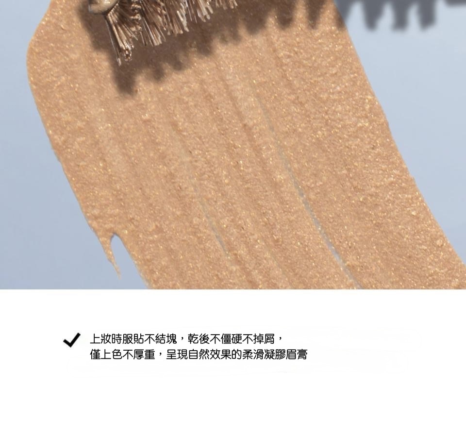 獨特奶油凝膠質地,上妝不卡毛、不結塊,乾了也不會讓眉毛僵硬刷白。
