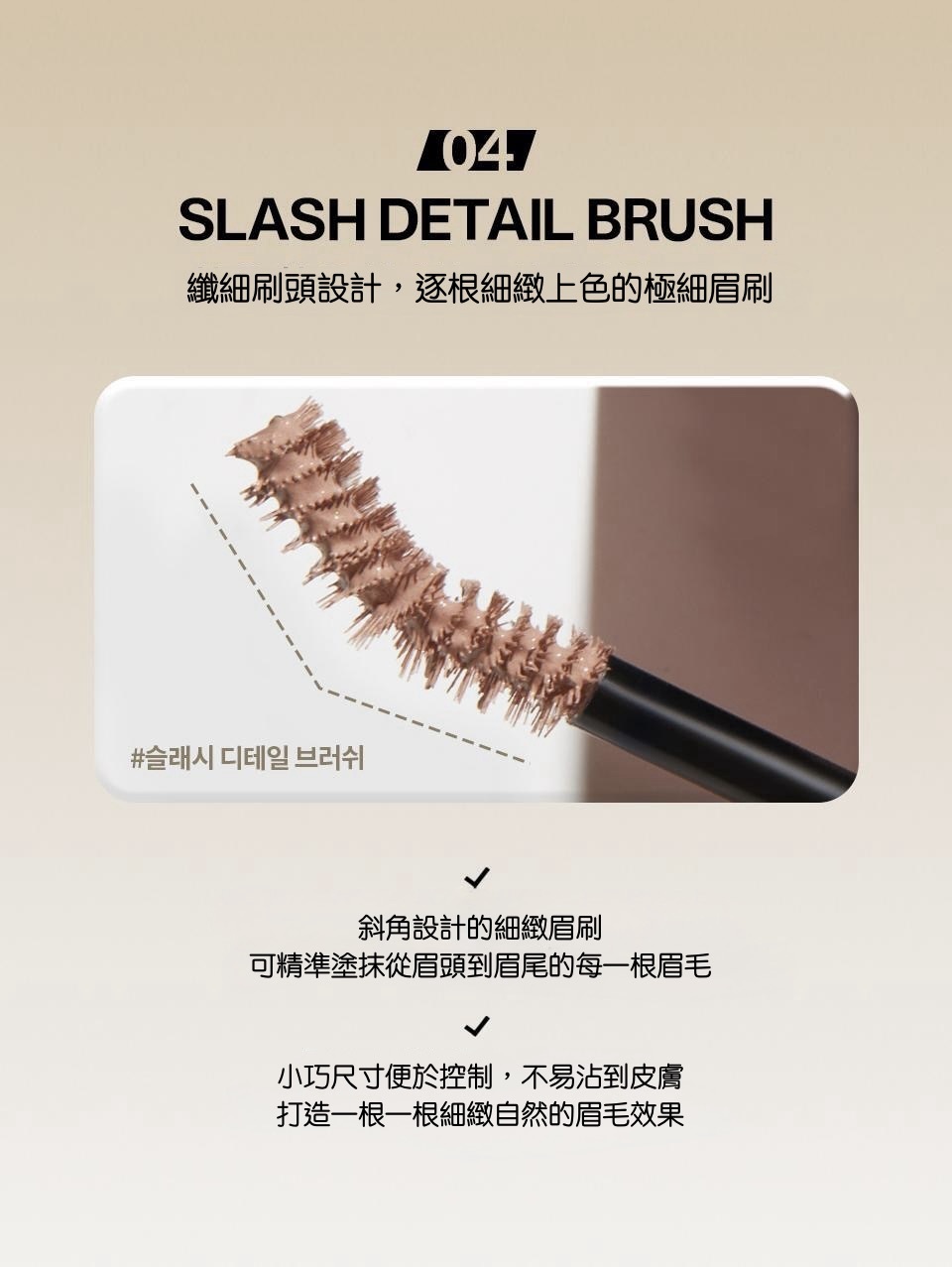 搭配斜角纖細刷頭,從眉頭到眉尾都能精準上色,輕鬆打造乾淨俐落的自然眉型。